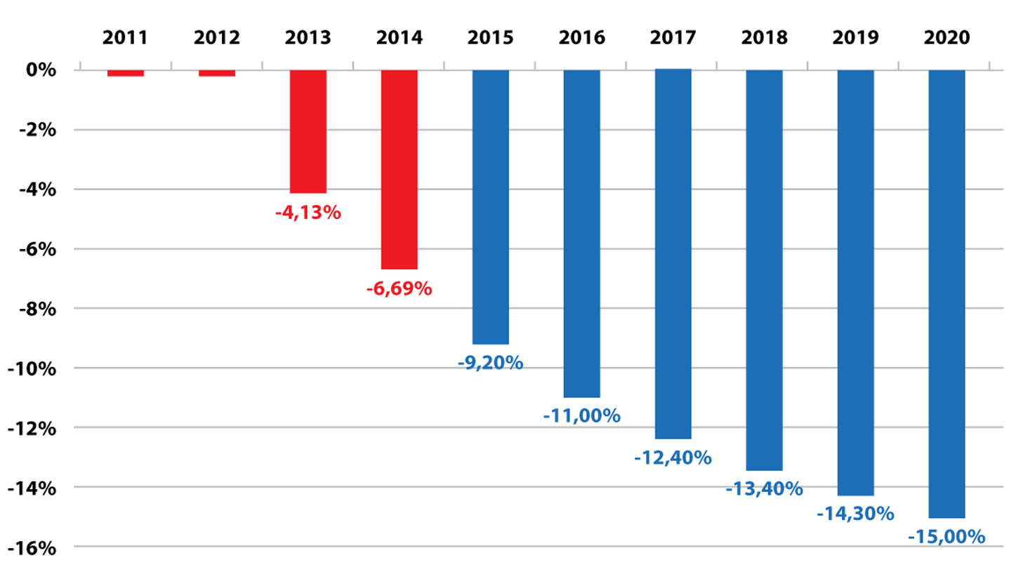 *Esempio di danno economico dovuto al Potential Induced Degradation. Impianto fotovoltaico da 1MW di un nostro cliente italiano, dove il degrado da P.I.D., iniziato nel 2012, in due anni ha raggiunto il 6,69%, con un danno economico di € 66.000. Se nel 2014 non fosse stato installato APID, nel 2020 la percentuale di calo di potenza avrebbe raggiunto il -15%, con